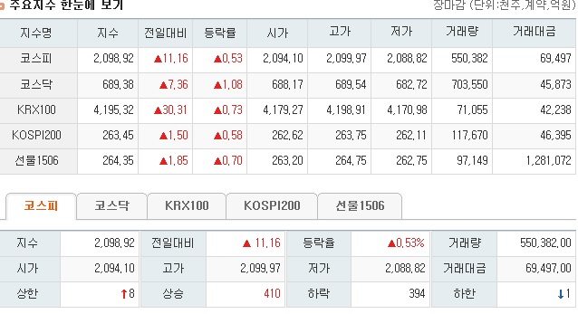 이미지 확대보기일평균거래대금은 7조원에 육박했다. 장후반 외국인과 개인의 동반 매수세에 힘입어 2090선을 유지하면서 박스권 돌파 기대감으로 연중 최고치 경신 행진을 이어갔다.