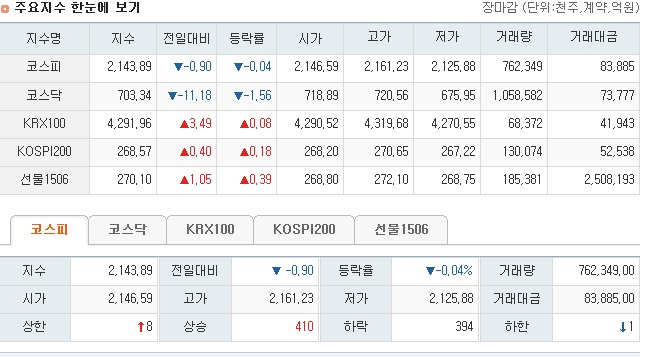 전 거래일보다 1.80포인트(0.08%) 오른 2146.59로 출발한 이날 코스피는 외국인 순매수에 힘입어 장중 2150선을 돌파했지만 기관과 개인의 동반 매도세에 하락 전환했다.