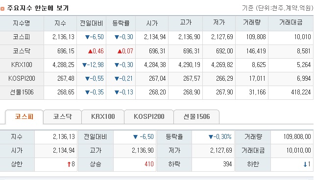 이런 가운데 전 거래일보다 7.69포인트(0.36%) 오른 2134.94에 출발한 코스피는 외국인은 47억원, 개인 310억원 순매수를 보이고 있는 반면 기관은 317억원 순매도를 보이고 있다. 프로그램은 차익, 비차익 순매수로 134억원의 매수 우위를 나타내고 있다.
