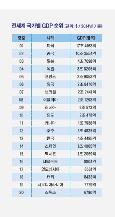 그 다음이 중국, 일본, 독일, 프랑스, 영국 등의 순이다. 국제통화기금(IMF)이 발표한 2014년 통계 기준이다.