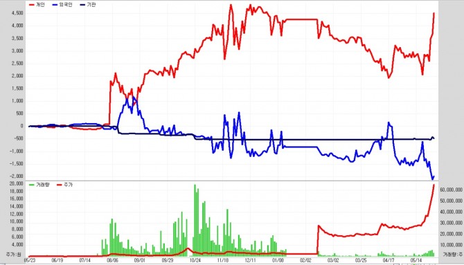 진원생명과학 투자자 매매추이 그래프에서도 확연하게 드러납니다. 검은색선이 기관인데 일직선으로 나온다는 건 사지도 팔지도 않았다는 거죠. 빨간색으로 표시된 개인과 파란색의 외국인만 활발하게 움직이지요. 외국인도 진짜 외국인인지 의심스럽지만 말입니다.