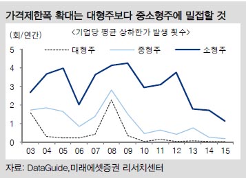 ② 대형주 보다는 중소형주, 그리고 주가 하락 기업보다 상승기업에 좀 더 민감할 수 있다. KOSPI 대형주가 1 년에 한 차례라도 상한가를 기록할 확률은 10%미만, 중형주는 50%, 소형주는 종목 당 평균 2.6 회를 기록하고 있다. 발생 빈도 측면에 있어서도 하한가 보다 상한가 기업이 최소 1.5 배에서 최대 3.8 배까지 많은 것이 현실이다.