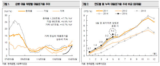 KB투자증권 유승창 연구원은 "5월말 예금은행의 원화대출 잔액은 1229조원을 기록했다"며 "주택담보대출 및 중소기업대출이 전년대비 각각 14.7%, 8.7% 증가하면서 높은 성장세를 유지한 것으로 판단한다"고 분석했다.