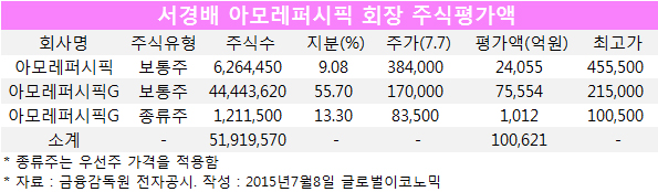 서 회장이 갖고 있는 주식 수에 7일의 종가를 곱하면 서 회장의 보유주식 평가액이 산정된다. 그 결과 아모레퍼시픽 보통주 2조4055억원, 아모레퍼시픽그룹 보통주 7조5554억원, 아모레퍼시픽그룹 종류주 1012억원 등 총 10조621억원으로 나타났다.