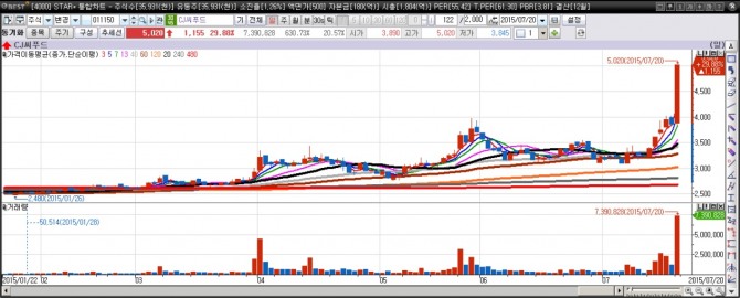 오늘 상한가를 기록한 CJ씨푸드는 외국인들이 7거래일 연속 순매수하며 시세를 주도하고 있습니다. 기관에서 차익매물로 보이는 2만7000주를 매도하긴 했지만 추세를 꺾을 만한 규모는 아닌 것 같습니다.