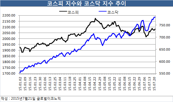 소폭 오름세로 출발했던 코스피 지수는 장중 한때 약세흐름을 보이기도 했지만 장 후반 상승흐름을 되찾았다. 국내 기업들의 실적 우려에도 불구하고 달러 강세효과에 대형 수출주가 지수를 견인했다. 개인과 기관이 동반 순매수하며 힘을 보탠 반면 외국인은 사흘연속 매도세를 이어갔다.
