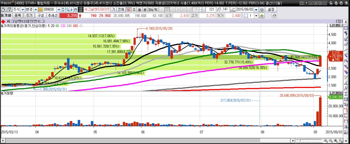 시그널엔터테인먼트는 올해 1월초 700원 대부터 상승하기 시작 5월말 4740원 고점을 형성하고 하락추세가 진행 중이었다. 향후 주가는 3300원대에 걸쳐있는 60일 이동평균선 돌파 후 얼마나 견조한 조정를 거쳐 재상승 할 수 있느냐에 달렸다고 보여진다.