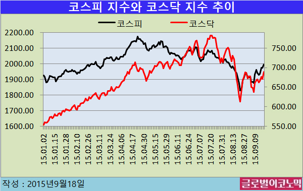 코스피는 미 금리 동결에도 불구하고 하락 출발했으나 오후 들어 외국인의 순매수 전환에 힘입어 상승전환했다. 외국인이 2 거래일 연속 순매수를 이어간 가운데 1990선을 회복하며 2000선에 바짝 다가섰다. 외국인은 이날 1628억원 어치를 사들였다.