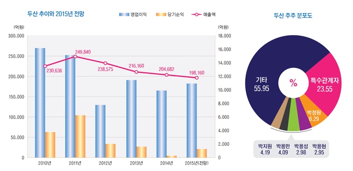 두산의 지배구조는 박용곤 명예회장을 포함해 특수관계인이 보통주 기준으로 전체의 44.05%인 936만9395주를 갖고 있다. 박용곤 명예회장은 비등기임원으로 되어 있다.