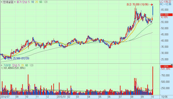 이날 유가증권시장에서 섬유·의복 관련 종목들이 큰 폭으로 올랐다. TPP 타결로 인한 최대 수혜주로 꼽히는 종목은 베트남 생산 비중이 60%에 달하는 한세실업이다. 한세실업은 유가증권시장에서 장중 한때 7만원까지 오르며 TPP 수혜 기대감에 연중 최고치를 기록하기도 했다.