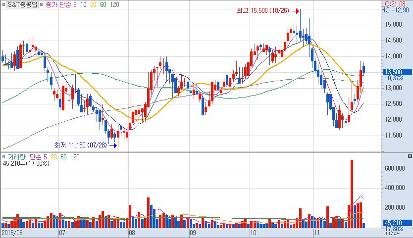 SK증권 이지훈 연구원은 "S&T 중공업은 작년 매출액 5585억원, 영업이익 -37억원으로 적자를 기록했다"며 "하지만 실적이 빠르게 개선되고 있어 올해 매출액 5300억원, 영업이익 380억원으로 흑자전환하면서 영업이익률도 7.2%까지 높아질 것"으로 예상했다.