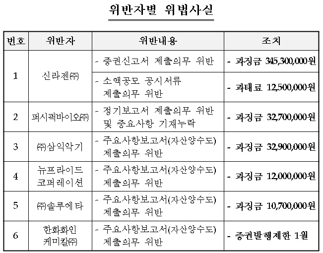 퍼시픽바이오는 정기보고서 제출의무 위반 및 중요사항 기재누락을 이유로 과징금 부과 조치를, 솔루에타는 주요사항보고서 제출의무 위반을 이유로 과징금 부과 조치를 받았다.