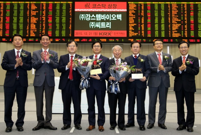 [글로벌이코노믹 최성해 기자] 한국거래소 코스닥시장본부는 21일 (월) 오전8시40분부터 서울사옥 홍보관에서 제대혈 줄기세포치료제 전문업체인 강스템바이오텍과 로자틴정 등 의약품 전문 제조업체인 씨트리의 코스닥시장 신규상장기념식을 개최했다.