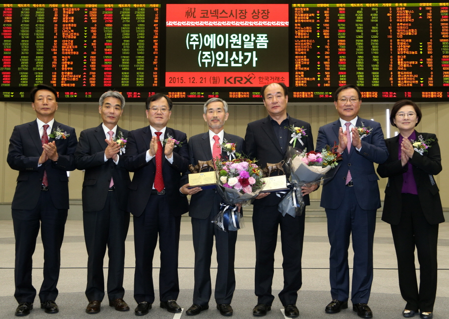 [글로벌이코노믹 최성해 기자] 한국거래소 코스닥시장본부는 21일(월) 오후 1시 30분부터 서울사옥 홍보관에서 건설자재 임대 전문기업인 에이원알폼과 죽염제조 전문기업인 인산가의 코넥스시장 신규상장기념식을 개최했다.