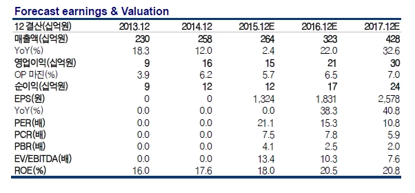 올해 큰 폭 실적개선이 기대된다. 지난해 실적은 납품가 하락 및 Tesla Model X 출시 지연 등으로 2014년과 유사한 수준이 예상된다. 그러나 올해 실적은 매출액 3225억원(yoy+22%), 영업이익 211억원(yoy+40%), 순이익 167억원(yoy+35%)으로 큰 폭으로 개선될 것으로 보인다.