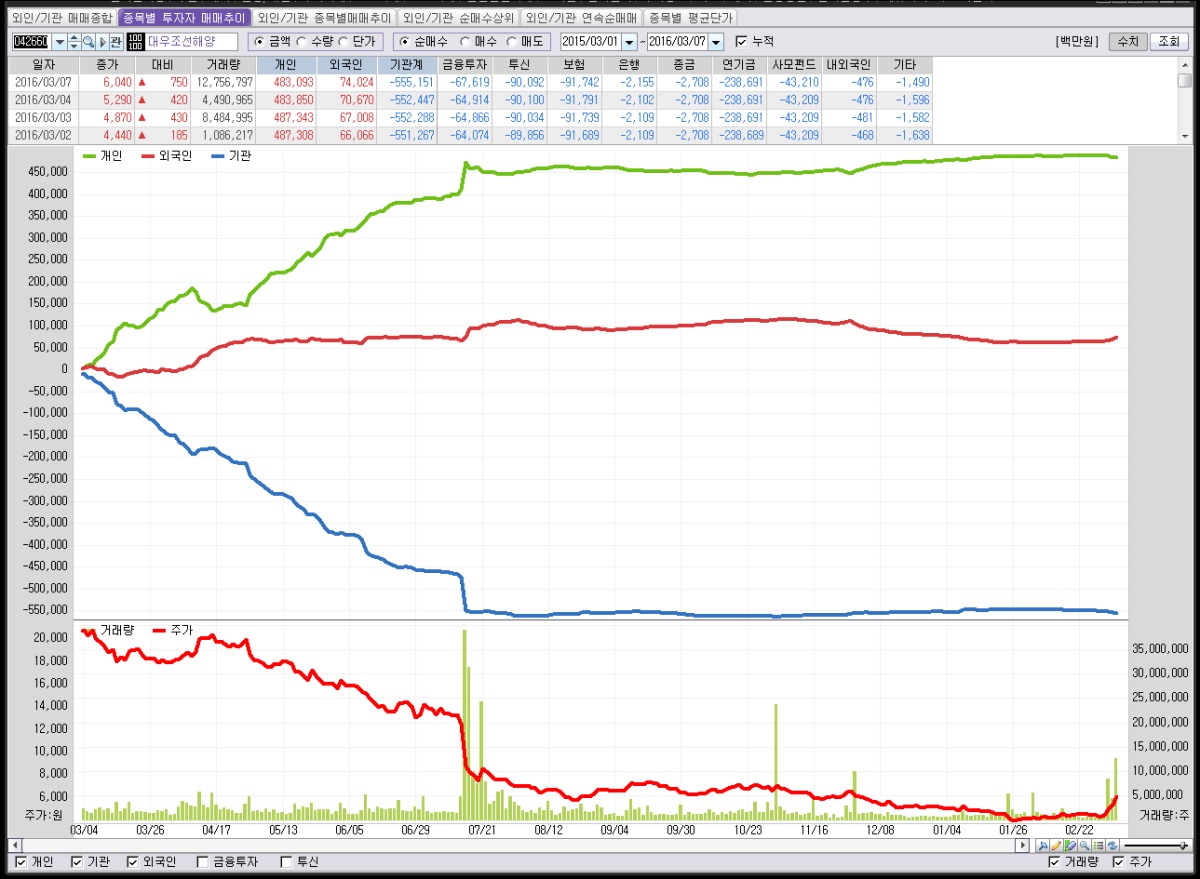 대우조선해양은 지난해 신용평가사로부터 투기등급으로 강등 당하 등으로 온갖 악재로 주가가 약세를 면치 못했지만 이란 수주 기대감으로 살아나는 모습입니다. 향후 주가 향방의 키는 최근 대규모 매수세를 유입시킨 외국인이 아닌가 합니다.