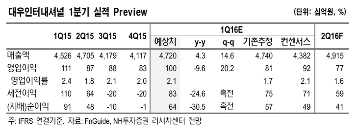 이미지 확대보기대우인터내셔널의 1분기 실적은 매출액 4조7200억원(4% y-y), 영업이익 1002억원(-10% y-y), 세전순이익 826억원(-25% y-y)으로 시장 컨센서스를 상회할 전망이다.