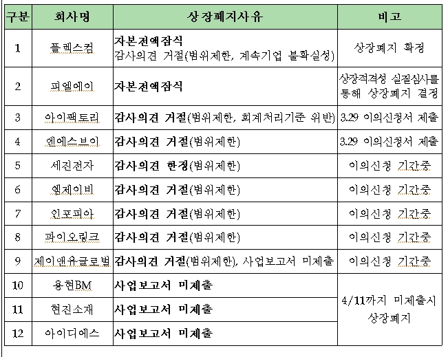 감사범위 제한으로 인한 감사의견 거절․한정은 상장폐지 통보일로부터 7일내 이의신청하되 이의신청일로부터 15일내 기업심사위원회 심의를 거쳐 상장폐지 여부가 결정된다. 사업보고서 미제출은 사업보고서 제출시한 이후 10일이내(2016.4.11까지) 미제출시 상장폐지된다.