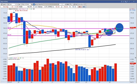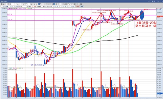 하지만 코스피 지수 주봉 그래프에는 빨간 양봉이 마크됐다. 이는 국내 증시의 향후 행로를 암시한 것이다. 즉 가겠다는 얘기다. 그래프에는 시장의 심리가 담겨있기 때문이다.