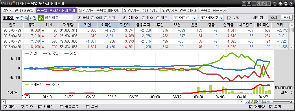 이미지 확대보기영진약품의 급등과정을 보면 투신 등 기관은 이 흡수합병 정보를 미리 알고 있지 않았나 하는 생각이 듭니다. 기관의 매매(이베스트투자증권 HTS 집계 기준)를 보면 28일 이전부터 지속적으로 매집을 해왔더군요.