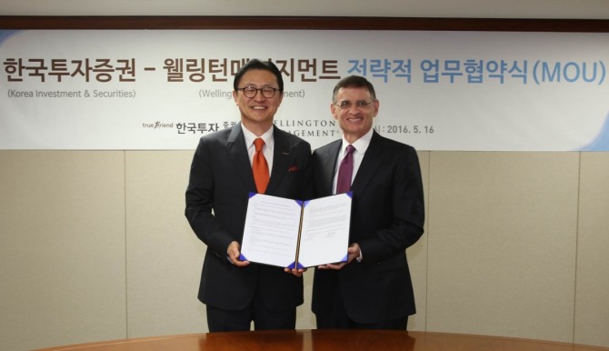 이미지 확대보기한국금융지주(071050) 자회사 한국투자증권은 세계 8위 기관자금 운용을 자랑하는 미국 웰링턴 매니지먼트(Wellington Management)와 글로벌 상품의 리테일 제공을 위한 MOU(전략적 사업제휴)를 16일 체결했다고 밝혔다.