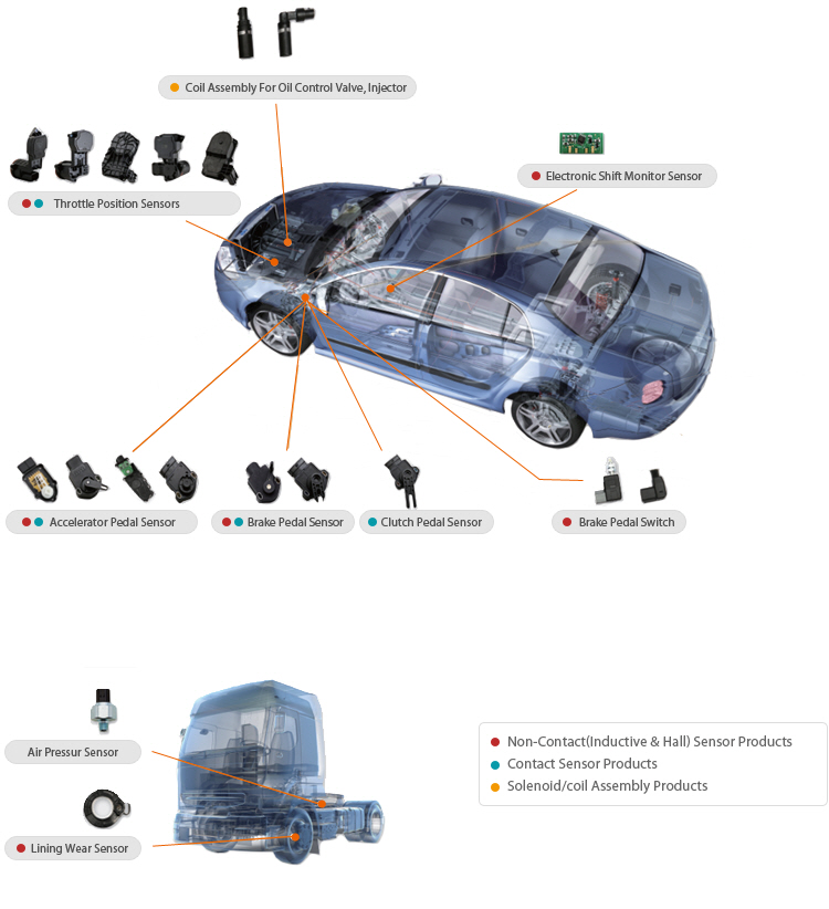 자동차용 APS(Accelerator Pedal Sensor), BPS(Brake Pedal Sensor), TPS(Throttle Position Sensor) 등의 센서를 개발해 만들고 있다.