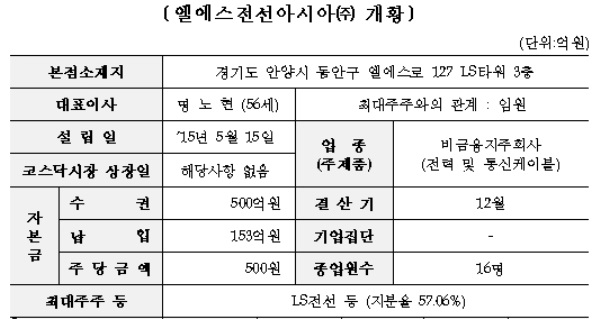 먼저 엘에스전선아시아㈜(대표이사 명노현)는 LS전선㈜가 LS-VINA와 LSCV(베트남 소재 전력․통신케이블생산 현지법인)의 상장을 위해 ‘15.5월 한국에 설립한 지주회사로서 베트남 전선시장 1위 업체(시장점유율 30%)다.