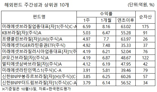 15일 한국펀드평가 펀드스퀘어가 지난 13일 공시 기준으로 해외 주식형펀드 2977개의 평균 주간 수익률이 -0.41%로 저조한 가운데 브라질 주식형 펀드가 6.6%대로 호실적을 기록했다.