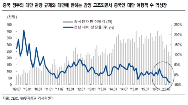 NH투자증권은 최근에 중국과의 정치적 갈등을 빚은 대만과 일본 사례에 비추어 볼 때, 국내 중국 관련 소비재 업체들의 향후 실적과 주가에 부정적 영향이 확대될 것이라고 분석했다.