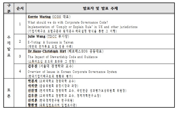 한국기업지배구조원과 한국예탁결제원은 국내외 전문가를 초빙하여 기업지배구조 모범규준과 원칙준수•예외설명 공시방식, 스튜어드십 코드의 도입과 효과, 전자투표제도와 관련한 성공적인 의결권 활성화 사례, 그리고 한국기업지배구조의 현황 등 다양한 사안을 고찰하고, 이를 바탕으로 향후 국내 기업지배구조의 개선방안을 모색하고자 국제컨퍼런스를 공동개최했다는 설명이다.