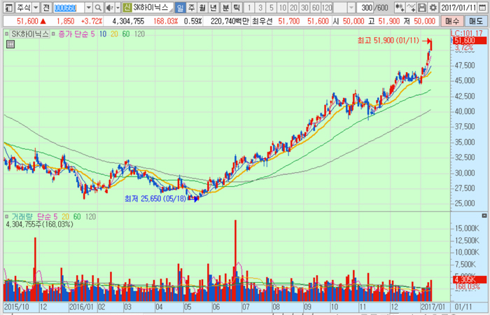 SK하이닉스의 주가는 11일 종가 5만1600원으로 2016년 5월 18일의 저점 2만5650원에 비해 101.2% 상승한 수준에서 거래되고 있다.