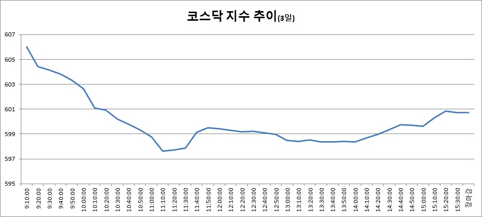 3일 코스닥은 전거래일대비 8.20포인트(1.35%) 떨어진 600.73으로 마감했다. 장중 600선이 무너졌으나 장 막판 간신히 회복하는데 성공했다.