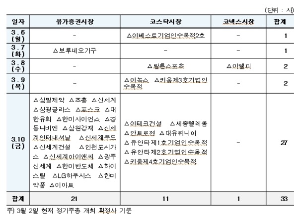 이미지 확대보기5일 예탁결제원에 따르면 3월 둘째주에는 12월 결산 상장법인 33개사가 정기주총을 개최할 예정이다.