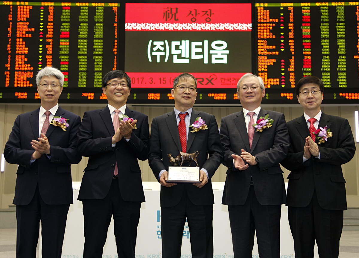 이미지 확대보기한국거래소 유가증권시장본부는 15일 오전8시40분부터 서울사옥 홍보관에서 치과용 임플란트 및 관련 기기 제조업체인 (주)덴티움의 유가증권시장 신규상장기념식을 개최했다. 상장기념패 전달 후 기념촬영 왼쪽부터 이호철 한국IR협의회 회장, 이은태 한국거래소 유가증권시장본부장, 강희택 (주)덴티움 대표이사, 정영채 NH투자증권 부사장, 김정운 한국상장회사협의회 부회장./사진=한국거래소[글로벌이코노믹 유병철 기자] 덴티움이 상장 첫날 시초가(3만8200원)대비 약세를 나타내고 있다.