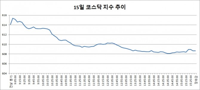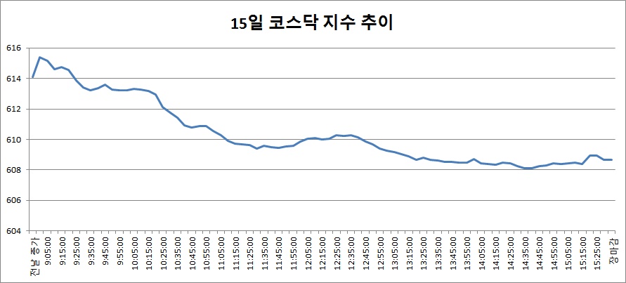 15일 코스닥은 전거래일대비 5.44포인트(0.89%) 떨어진 608.68로 마감했다.