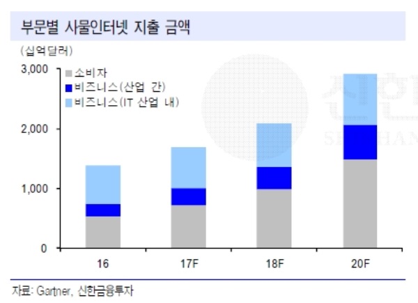 김영환 신한금융투자 연구원은 지난 8일 보고서를 통해 "4차 산업혁명은 ‘기계의 능동적 업무 수행’을 가능케 하는 인공지능 중심 기술혁신을 뜻한다”라며“2020년까지 사물인터넷 지출 연평균 20.6% 증가가 기대되는데, 이 같은 고성장추세는 IT 하드웨어 업종에 기회”라고 분석하기도 했다.