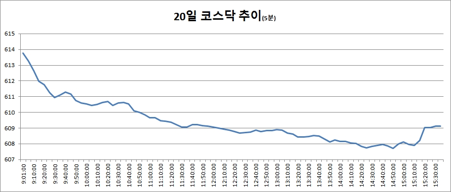 20일 코스닥은 전거래일대비 4.15포인트(0.68%) 떨어진 609.11로 마감했다. 지난 15일 이후 3거래일만에 다시 610선을 내줬다.