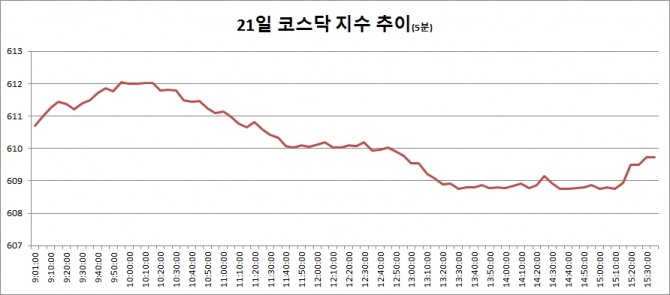 21일 코스닥은 전거래일대비 0.62포인트(0.10%) 오른 609.73로 마감했다. 코스닥이 반등한 것은 지난 16일 이후 3거래일 만이다.