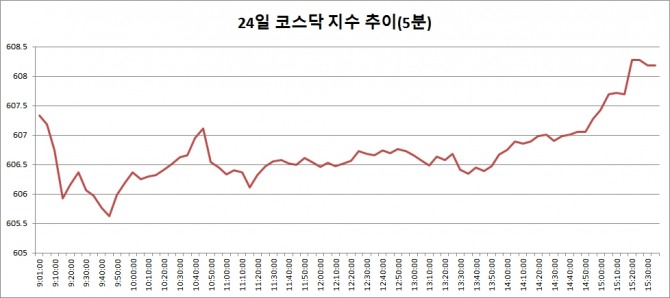 24일 코스닥은 전거래일대비 2.65포인트(0.44%) 오른 608.18로 마감헀다.