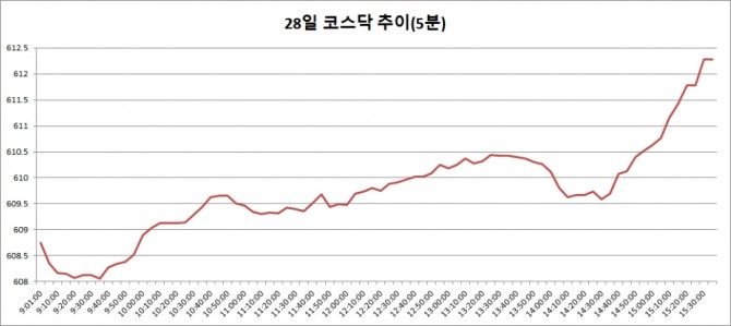 28일 코스닥은 전거래일대비 5.21포인트(0.86%) 오른 612.28로 마감했다. 코스닥이 종가 기준으로 610선을 회복한 것은 지난 17일(613.26) 이후 7거래일 만이다.