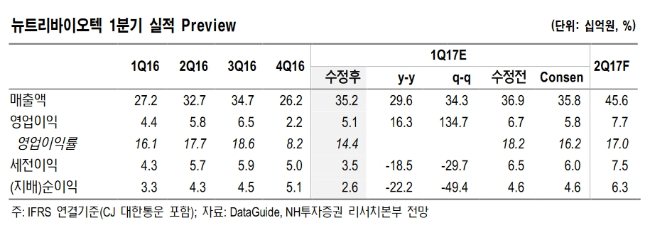 이 연구원은 뉴트리바이오텍의 1분기 연결 매출액과 영업이익은 각각 전년대비 30% 늘어난 352억원과 16% 증가한 51억원으로 전망했다.