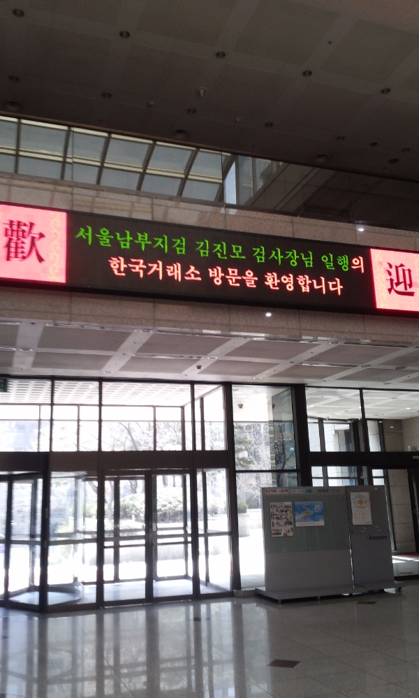 방문 당시 거래소는 전광판을 통해 “서울남부지검 김진모 검사장님 일행의한국거래소 방문을 환영한다"고 환영인사를 밝히기도 했다.