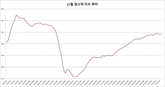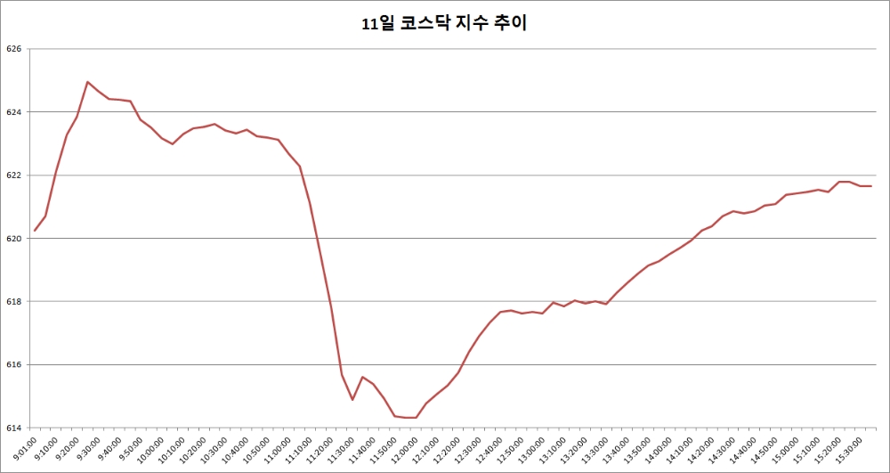 11일 코스닥은 전거래일대비 2.23포인트(0.36%) 오른 621.64로 마감했다.