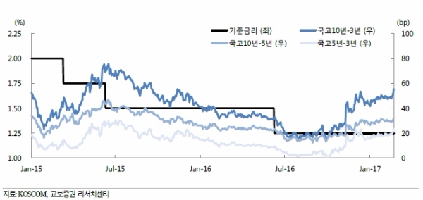 박종연 NH투자증권 채권투자전략팀장은 "단기적으로는 국제유가의 횡보세로 기저효과가 약화되면서 미국의 일부 경제 지표 및 물가지표의 둔화가 예상되며 트럼프 정부의 친성장정책 지연으로 미국채 10년 금리는 2.00%까지 하락할 것”이라며 “국내금리도 지정학적 리스크가 확대되지만 않을 경우 미국채 금리의 하락세를 추종할 전망이므로 2분기중에는 트레이딩 관점에서 10년물의 롱(Long) 포지션을 유지하기를 권고한다”고 말했다.