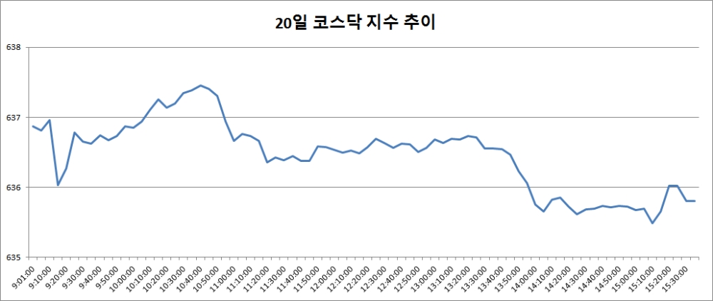 이미지 확대보기20일 코스닥은 전거래일대비 0.19포인트(0.03%) 떨어진 635.80으로 마감했다. 장 초반 상승세로 출발한 코스닥은 오후 들어 약세로 돌아섰다. 이후 보합권에서 등락을 거듭하다 장 막판 하락 마감했다.