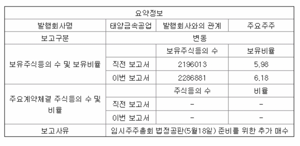 태양금속(공업)의 경우 개인투자자인 노회현 씨는 21일 공시를 통해 태양금속 주식 9만868주(지분 0.2%)를 장내에서 추가 매입해 보유지분이 6.18%로 증가했다고 밝혔다.