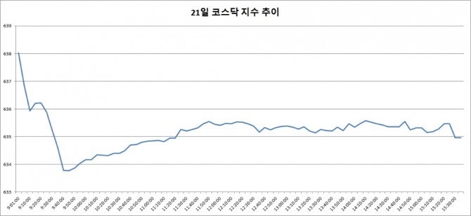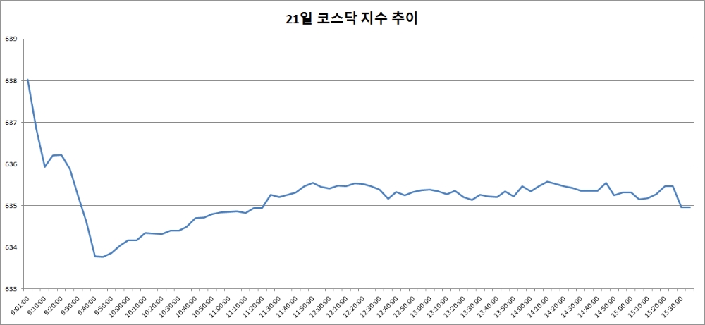 21일 코스닥은 전거래일 대비 0.84포인트(0.13%) 떨어진 634.96으로 마감했다. 코스닥은 이날 상승세로 출발했지만 오전 중 약세로 돌아섰고 내내 하락 추세를 유지했다.