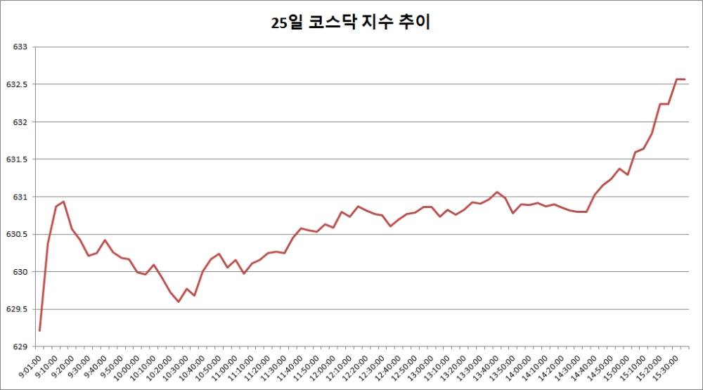 25일 코스닥은 전거래일대비 5.95포인트(0.95%) 오른 632.57로 마감했다.