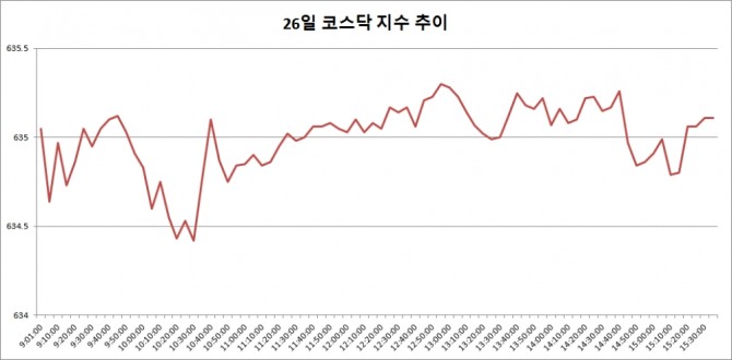 26일 코스닥은 전 거래일 대비 2.54포인트(0.40%) 오른 635.11로 마감했다. 전날에 이어 이틀 연속 오름세다.