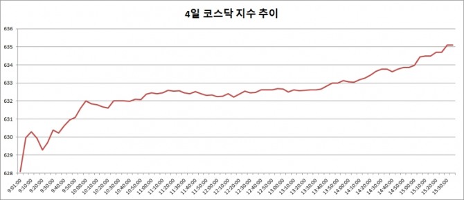 이미지 확대보기4일 코스닥은 전거래일대비 8.68포인트(1.39%) 오른 635.11로 마감했다. 4거래일만에 반등하며 지난달 27일(631.11) 이후 처음으로 630선을 회복했다.